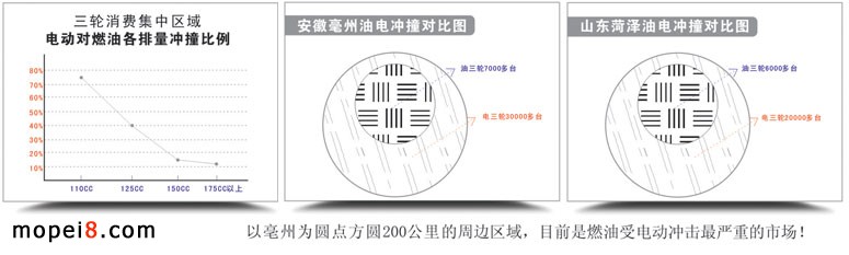 我們走訪注意到,以亳州為圓點方圓100公里的周邊市場,如阜陽、商丘、淮北等燃油三輪也同樣遭受著電動的強烈沖擊。“這一區域目前是受電三沖擊最最突出的市場!”