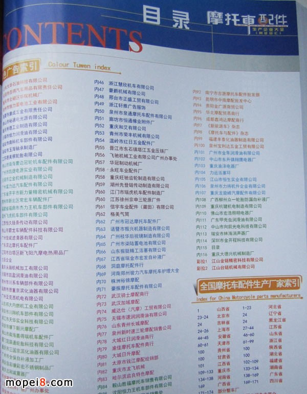 2015年《摩托車配件生產企業大全》升級版對2013版進行了大力度的調整:刪除了2013年之前銷聲匿跡的單位,盡管有的電話是可以打通的,比如浙江和河北刪除的單位比較多。本次版本里的所有單位都是有具體出處和來歷的,而且是這兩年來經營比較活躍的單位。